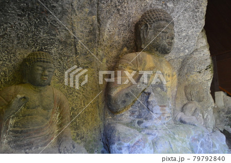 釈迦如来(中央)・阿弥陀如来(左)・薬師如来(右)(山王山石仏群・国宝 臼杵石仏/大分県臼杵市)