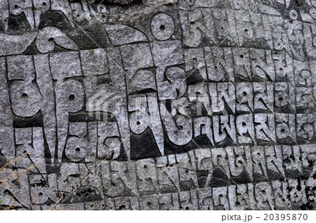 Ancient buddhist carved stone wall with mantras