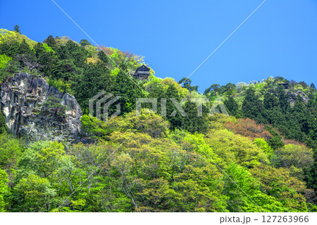 滋賀県東近江市 新緑の百済寺本堂下にある巨木の観音杉と仁王門