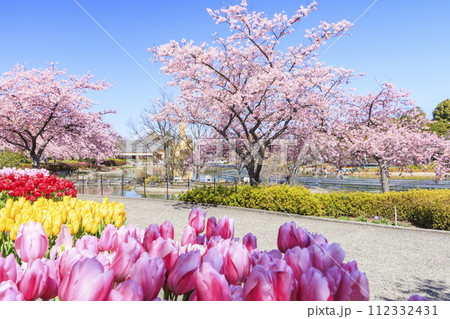 青空に映えるランドマークタワー 公園に咲く花々 青空の広がる浜名湖ガーデンパーク ガーデニング 春の