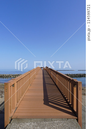 晴れ渡った日本海に突き出した夕凪の橋(新潟県出雲崎町)