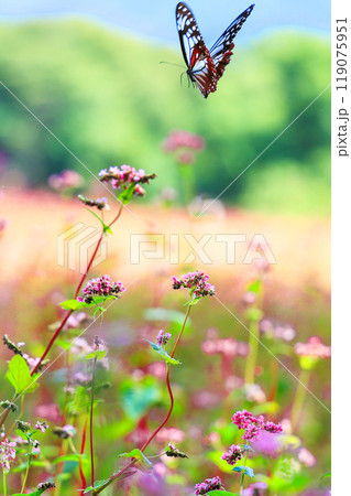 一面に広がる赤そばの花畑と散策する女性(箕輪町 赤そばの里)