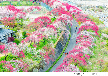 埼玉県秩父郡東秩父村大内沢 早春の里山の斜面に、ピンクが鮮やかな花桃の花が咲き乱れる大内沢花桃の郷
