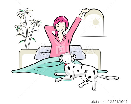 ベッドで起きる女性(ママ)と犬(ダルメシアン)爽やかな朝|家族シリーズ