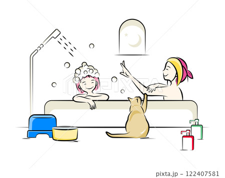 バスタイムにママ(お母さん)と親子一緒にお風呂に入る女の子と猫の|家族シリーズ