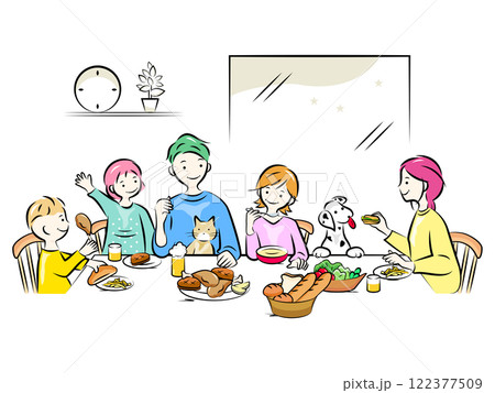 食事・夕食を楽しむ家族(パパ,ママ,男の子,女の子,犬,猫)|家族シリーズ