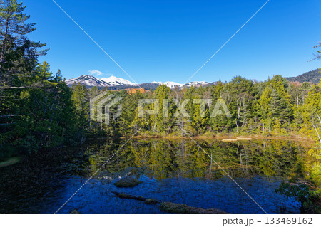 乗鞍高原・牛留池に映る常緑樹林と冠雪した山々の晩秋風景