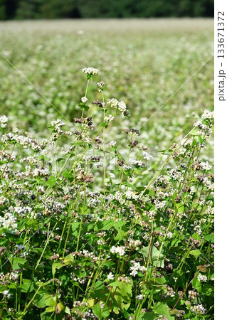 南会津に広がる白いそば畑と緑豊かな林が彩る初秋の景色(福島県)