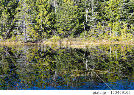 乗鞍高原・牛留池に映る常緑樹林の静かなリフレクション風景