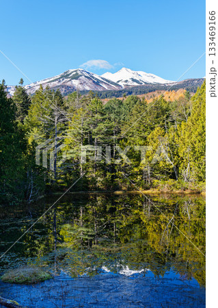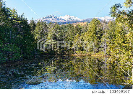 乗鞍高原・牛留池に映る常緑樹林と冠雪の乗鞍岳の風景