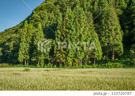 南会津に広がる白いそば畑と杉林が並ぶ初秋の風景(福島県)