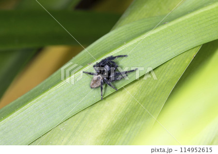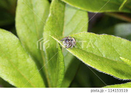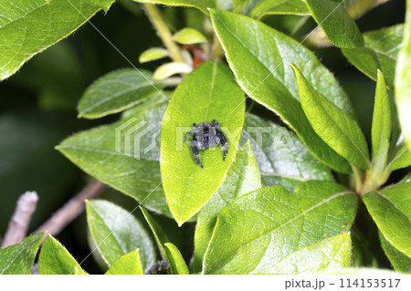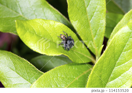 青葉の上にちょこんと愛らしい黒い頭部のネコハエトリ蜘蛛(自然光+マクロ接写写真)