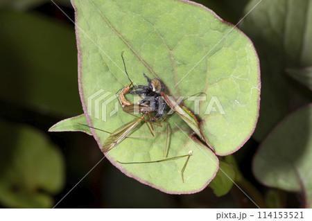 葉の上に雌のササグモ(自然光+ストロボ、マクロ接写撮影)