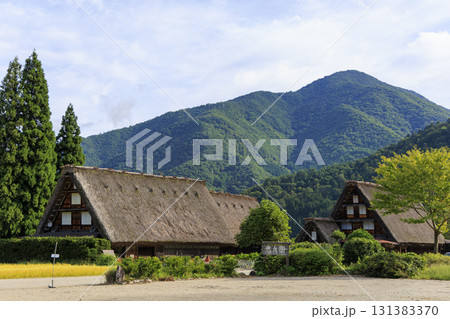 青空と白川郷の合掌造りが映える伝統的な茅葺き屋根の風景
