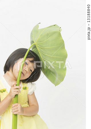 里芋畑で大きい葉っぱを傘にする女の子