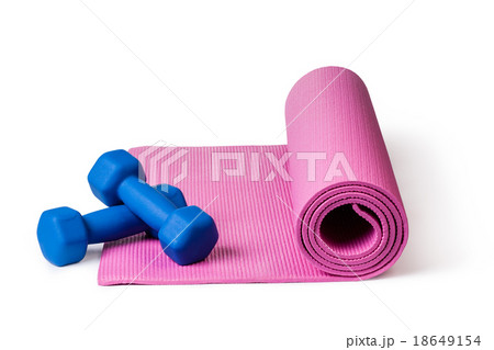Pair of dumbbells, a rubber fitness mat, and an exercise ball