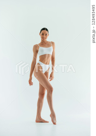 Full-length portrait of overweight woman posing in grey underwear, shows her confidence against white studio background.