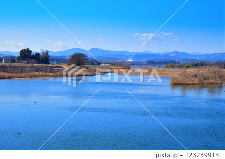 風光明媚 荒川本流の風景 秩父方面山並 深谷市 六堰頭首工付近