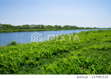 春の朝、晴れ渡った福島潟の水辺(新潟県新潟市)