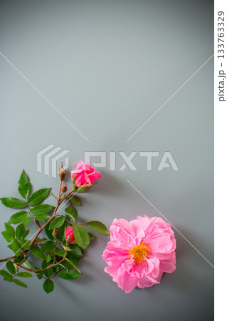 Minimalist garden rose arrangement on a gray background