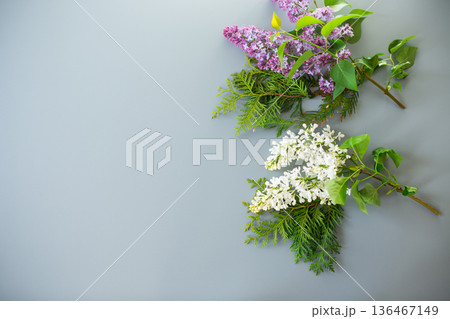 A branch of beautiful white and lilac lilacs in a vase on a gray background