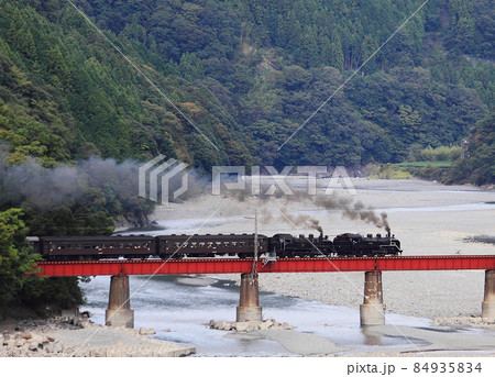大井川鐵道大井川本線で蒸気機関車が大井川に架かる鉄橋を通過中