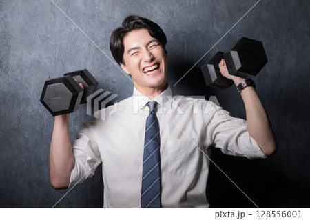 ダンベルで筋トレするスーツの男性 グレーバッグ営業マンは筋トレだ~
