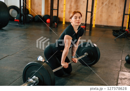 Leaning on the barbell. On the floor. Beautiful strong woman is in the gym