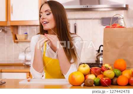Woman housewife in kitchen with many fruits