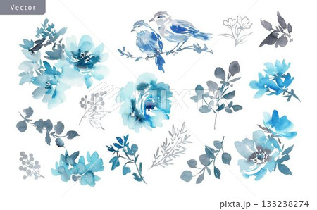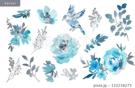水彩のおしゃれな青いバラ、鳥、葉のベクターイラストセット。手書きのボタニカルイラスト。