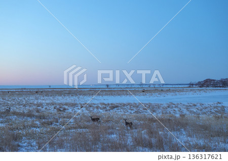 野付半島のエゾシカと沈む太陽