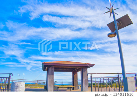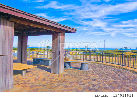 千年希望の丘8号丘東屋から望む海と風車の展望風景