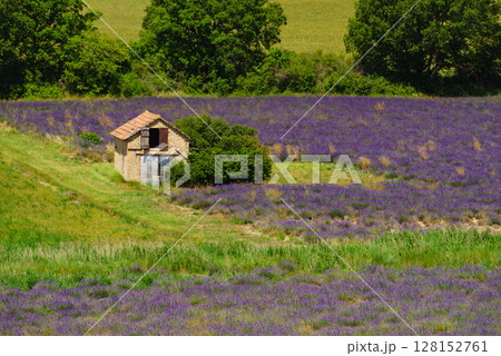 Lavender field in Provence, France, at sunrise, with a stone building