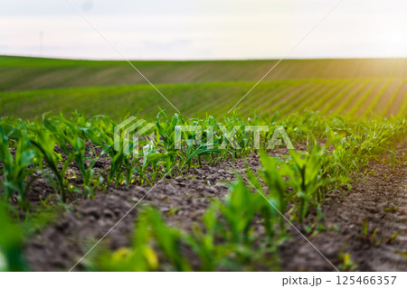 Healthy young corn sprouts grow steadily in a sunlit rural field, surrounded by lush green leaves and fertile soil, signaling bountiful agriculture