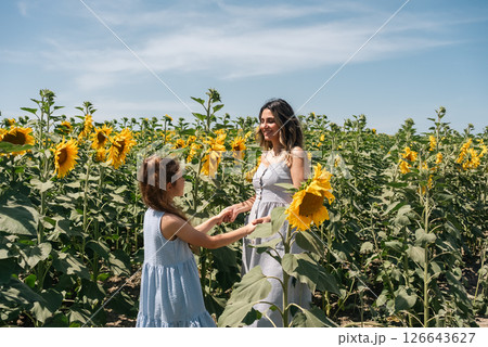 Mother and her little daughter standing in sunflower field.