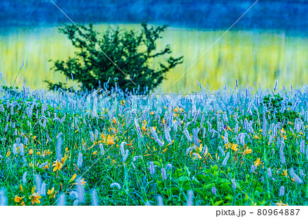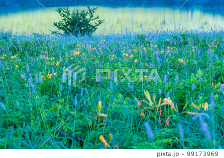 (群馬県)野反湖、湖畔に群生するノゾリキスゲとイブキトラノオ 夜明け