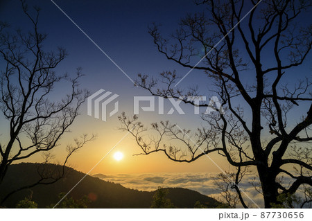 瀬戸内海国立公園野呂山鉢巻き山展望台よりの雲海に昇る朝陽