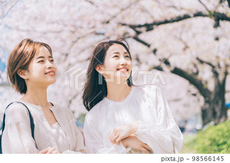 桜の名所を観光する女性(友達)