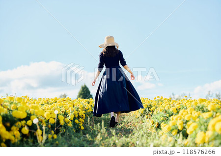 花畑の中を歩く女性