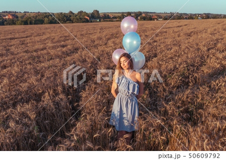Beautiful young girl happy smiling, summer field, behind balloons, free space. Emotions thoughts