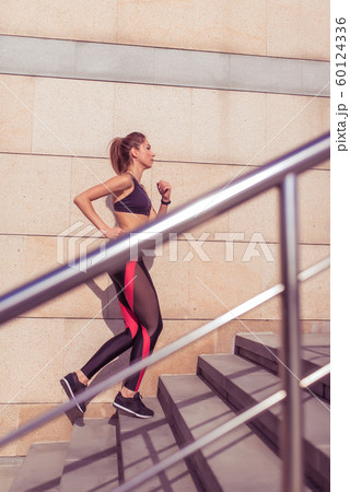 Young and athletic woman, runs up stairs, in summer on jogging in city, side view, sportswear. Workout athletics, day and morning. Active fitness lifestyle.