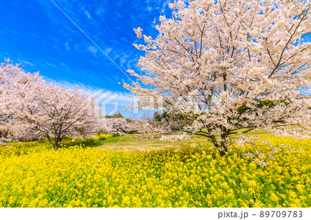 野岳湖レイクサイドグラウンドの桜と菜の花 パノラマ 【長崎県大村市】
