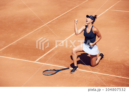 Top view image of young girl, professional tennis player showing emotions of win and success. Outdoor training