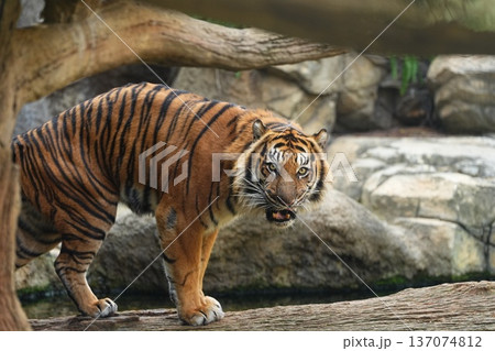 緑と岩場に囲まれたスマトラトラの力強いポートレート