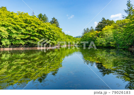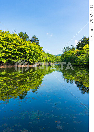 軽井沢 新緑の雲場池 リフレクション 縦構図