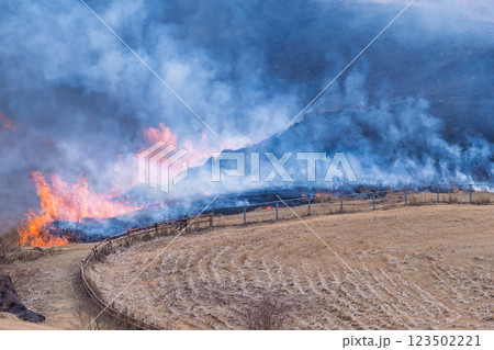春の風物詩に映える観光・行楽スポット 阿蘇の野焼きクローズアップ風景(俵山)