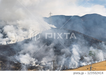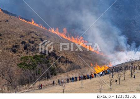 春の風物詩に映える観光・行楽スポット 阿蘇の野焼きクローズアップ風景(俵山)