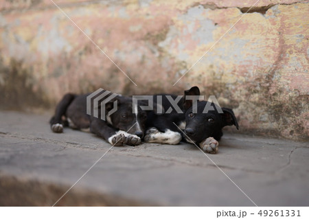 インドの山岳地帯 スピティ谷のカザ 可愛い野良犬 昼寝中の子犬