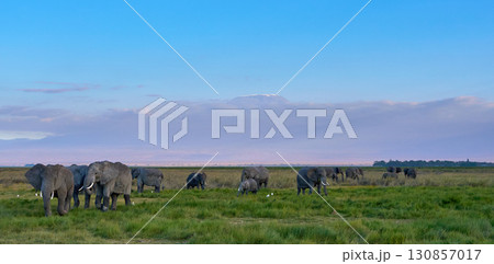 キリマンジャロを望むアンボセリのアフリカゾウの群れ