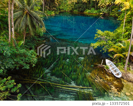 Lush tropical garden with banana plants and rustic wooden canopy under clear blue sky on redang Island. Malaysia